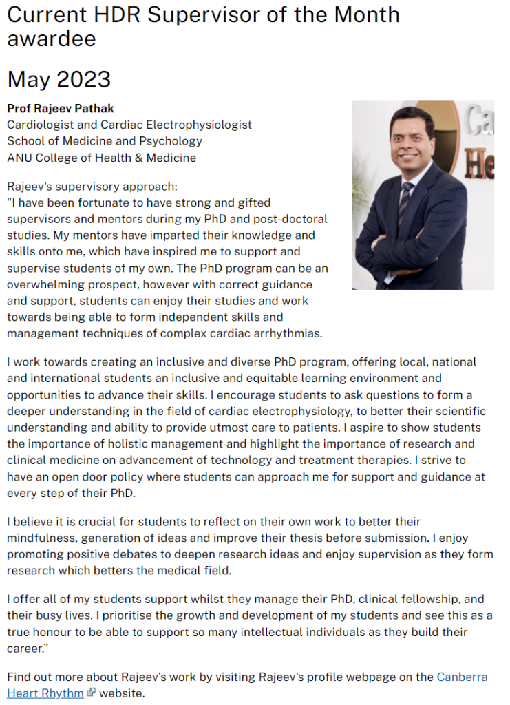Prof Rajeev Pathak, having been nominated current HDR Supervisor of the Month Awardee is an honourable and fortunate opportunity.