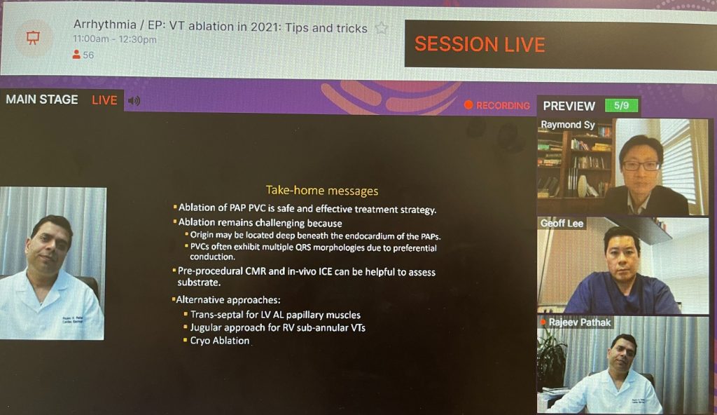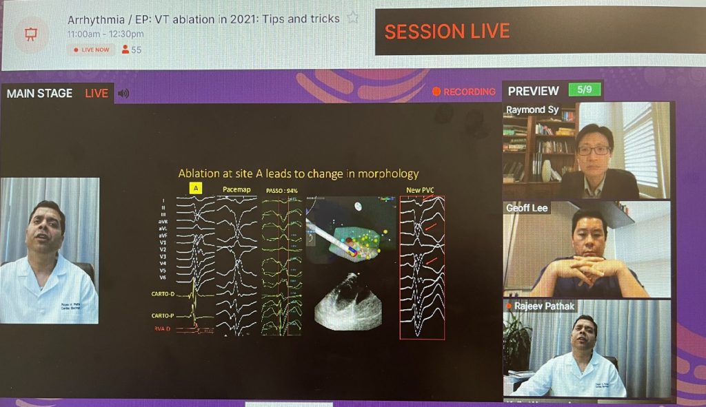 Premature ventricular contractions (PVCs) are extra heartbeats that begin in one of the heart’s two lower pumping chambers (ventricles). PVCs have been shown as potentially causing or contributing to cardiomyopathy and heart failure. At the recent CSANZ 2021 annual scientific meeting, Dr Rajeev Pathak presented two VT (ventricular tachycardia) ablations that he performed in Canberra to treat PVCs. These ablations were complex and technical but both procedures had good outcomes. Dr Pathak fielded many technical questions from other electrophysiologists and led an educational and informative discussion that will benefit other patients requiring complex VT ablations. Congratulations to Dr Pathak on this well received presentation. Dr Pathak’s work here in Canberra will benefit not only our patients at CHR but other patients around the world.
